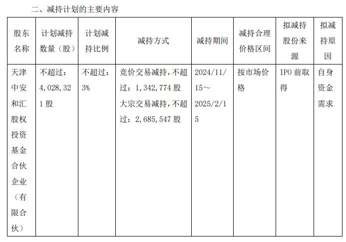 因自身资金需求,股东天津中安拟通过集中竞价、大宗交易的方式,合计减持不超过4,028,321股(不超过总股本的3%)。其中,通过集中竞价交易方式减持不超过1,342,774股(不超过总股本的1%)、大宗交易减持不超过2,685,547股(不超过总股本的2%)。减持期间为2024年11月15日至2025年2月15日。