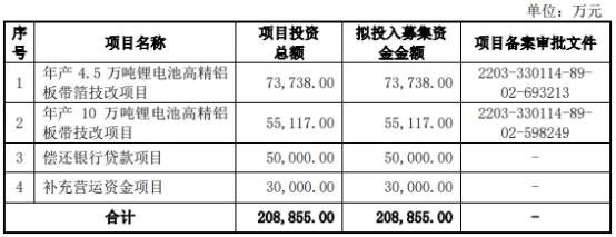 永杰新材拟在上交所主板募资208,855.00万元,用于年产4.5万吨锂电池高精铝板带箔技改项目、年产10万吨锂电池高精铝板带技改项目、偿还银行贷款项目和补充营运资金项目。