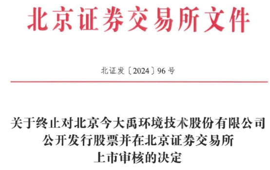 2024年9月25日,今大禹向北交所提交了《关于北京今大禹环境技术股份有限公司撤回向不特定合格投资者公开发行股票并在北京证券交易所上市申请文件的申请报告》,申请撤回申请文件。根据《北京证券交易所向不特定合格投资者公开发行股票并上市审核规则》第五十五条的有关规定,北交所决定终止今大禹公开发行股票并在北京证券交易所上市的审核。