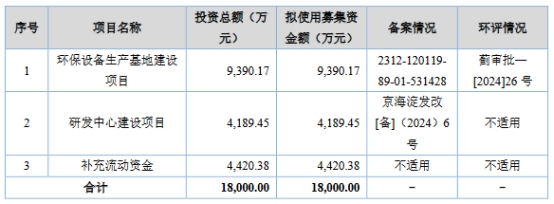 今大禹原拟募集资金18,000.00万元,分别用于环保设备生产基地建设项目、研发中心建设项目、补充流动资金。