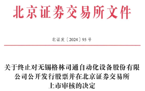 2024年9月25日,格林司通向北交所提交了《无锡格林司通自动化设备股份有限公司关于撤回向不特定合格投资者公开发行股票并在北京证券交易所上市申请文件的申请报告》,申请撤回申请文件。根据《北京证券交易所向不特定合格投资者公开发行股票并上市审核规则》第五十五条的有关规定,北交所决定终止格林司通公开发行股票并在北京证券交易所上市的审核。