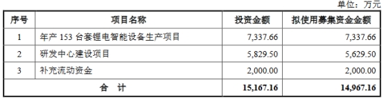 格林司通原拟募集资金14,967.16万元,分别用于年产153台套锂电智能设备生产项目、研发中心建设项目、补充流动资金。