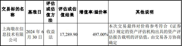 本次交易中,标的资产的交易价格参考评估结果确定。根据亚太联华评估出具的评估报告,以2024年6月30日为基准日,分别采用收益法和市场法对标的资产进行了评估,最终选择收益法评估结果作为评估结论。标的资产的评估情况如下:截至评估基准日2024年6月30日,敬在信息股东全部权益账面值为2,896.12万元,评估值17,289.90万元,评估增值14,393.78万元,增值率497.00%。