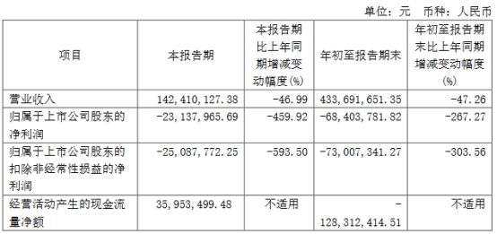 第三季度,公司实现营业收入1.42亿元,同比下降46.99%;归属于上市公司股东的净利润-2313.80万元,同比下降459.92%;归属于上市公司股东的扣除非经常性损益的净利润-2508.78万元,同比下降593.50%;经营活动产生的现金流量净额3595.35万元。