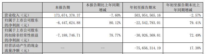 飞天诚信发布的2024年三季度报告显示,今年前三季度公司实现营业收入5.04亿元,同比下降2.57%;归属于上市公司股东的净利润-2254.28万元,同比增长79.41%;归属于上市公司股东的扣除非经常性损益的净利润-3092.64万元,同比增长72.49%;经营活动产生的现金流量净额-7565.63万元,同比增长17.38%。