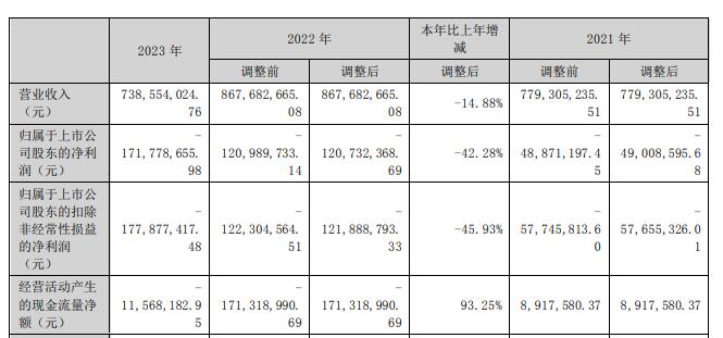 飞天诚信已连亏三年。2021年、2022年、2023年,飞天诚信实现归属于上市公司股东的净利润分别为-4900.86万元、-1.21亿元、-1.72亿元;归属于上市公司股东的扣除非经常性损益的净利润-5765.53万元、-1.22亿元、-1.78亿元。