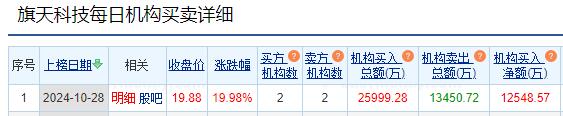 旗天科技涨停 三个交易日机构净买入1.25亿元