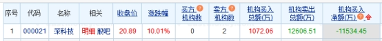 龙虎榜数据显示,卖出深科技金额最大的前5名中,2家为机构专用席位。经统计,机构席位今日卖出深科技净额为11534.45万元。