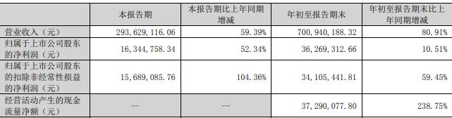 年初至报告期末,公司实现营业收入7.01亿元,同比增长80.91%;归属于上市公司股东的净利润3626.93万元,同比增长10.51%;归属于上市公司股东的扣除非经常性损益的净利润3410.54万元,同比增长59.45%;经营活动产生的现金流量净额为3729.01万元,同比增长238.75%。