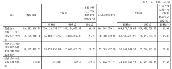 2024年前三季度,公司实现营业收入9.64亿元,同比增长10.98%;归属于上市公司股东的净利润7826.82万元,同比增长14.36%;归属于上市公司股东的扣除非经常性损益的净利润7200.55万元,同比增长30.34%;经营活动产生的现金流量净额为3419.63万元,同比下降23.98%。