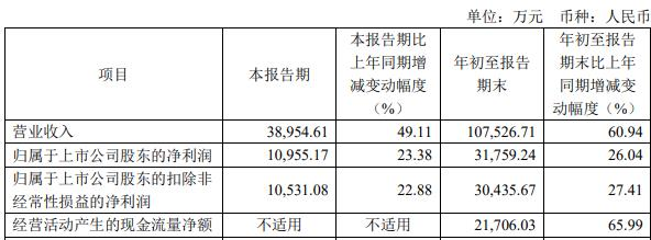 年初至报告期末,公司实现营业收入10.75亿元,同比增长60.94%;归属于上市公司股东的净利润3.18亿元,同比增长26.04%;归属于上市公司股东的扣除非经常性损益的净利润3.04亿元,同比增长27.41%;经营活动产生的现金流量净额为2.17亿元,同比增长65.99%。