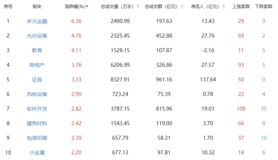 盘面上,多元金融、光伏设备、教育等板块涨幅居前,非金属材料、贵金属、小家电等板块跌幅居前。