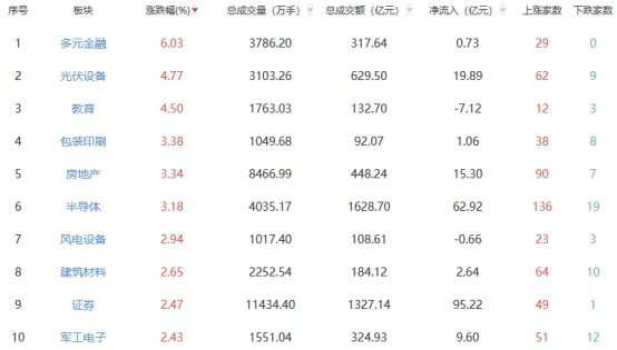盘面上,多元金融、光伏设备、教育等板块涨幅居前,贵金属、非金属材料、美容护理等板块跌幅居前。