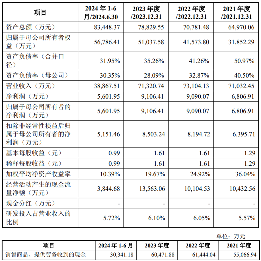 2021年至2024年1-6月,强达电路的营业收入分别为71,032.45万元、73,104.13万元、71,320.74万元和38,867.51万元;净利润/归属于母公司所有者的净利润分别为6,806.91万元、9,090.07万元、9,106.41万元和5,601.95万元;扣除非经常性损益后归属于母公司所有者的净利润分别为6,395.71万元、8,194.72万元、8,503.24万元和5,151.46万元。