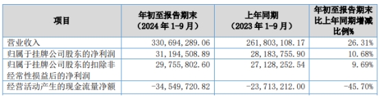 2024年前三季度,科拜尔营业收入为3.31亿元,同比增长26.31%;归属于挂牌公司股东的净利润3119.45万元,同比增长10.68%;归属于挂牌公司股东的扣除非经常性损益后的净利润2975.58万元,同比增长9.69%;经营活动产生的现金流量净额-3454.97万元,上年同期为-2371.32万元。