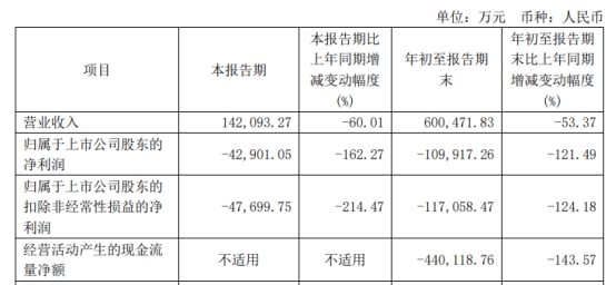 2024年前三季度,公司实现营业收入60.05亿元,同比下降53.37%;归属于上市公司股东的净利润-10.99亿元;归属于上市公司股东的扣除非经常性损益的净利润-11.71亿元;经营活动产生的现金流量净额-44.01亿元。