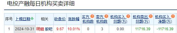 电投产融涨停 三个交易日机构净卖出1.17亿元