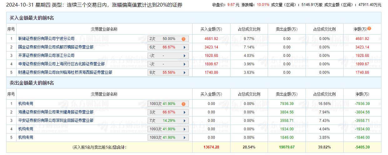 龙虎榜数据显示,电投产融为连续三个交易日内,涨幅偏离值累计达到20%的证券,卖出该股金额最大的前5名中,3家为机构专用席位。经统计,机构席位三个交易日卖出电投产融净额为11716.39万元。