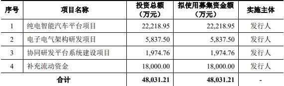 龙创设计原拟在深交所创业板发行股票数量不超过2,841.00万股,原拟募集资金48,031.21万元,计划用于纯电智能汽车平台项目、电子电气架构研发项目、协同研发平台系统建设项目、补充流动资金。
