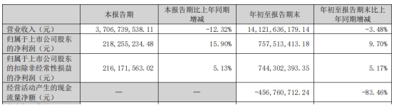 2024年前三季度,公司实现营业收入141.22亿元,同比下降3.48%;归属于上市公司股东的净利润7.58亿元,同比增长9.70%;归属于上市公司股东的扣除非经常性损益的净利润7.44亿元,同比增长5.17%;经营活动产生的现金流量净额为-4.57亿元。