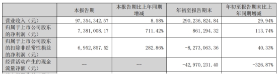 2024年前三季度,英诺激光实现营业收入2.90亿元,同比增长29.94%;归属于上市公司股东的净利润86.13万元;归属于上市公司股东的扣除非经常性损益的净利润-827.31万元;经营活动产生的现金流量净额为-4297.02万元。