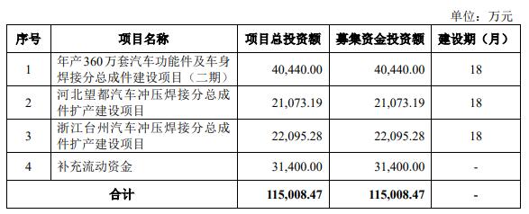 泰鸿万立拟在上交所主板募资11.5亿元,用于年产360万套汽车功能件及车身焊接分总成件建设项目(二期)、河北望都汽车冲压焊接分总成件扩产建设项目 、浙江台州汽车冲压焊接分总成件扩产建设项目、补充流动资金。