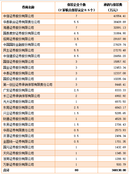 注:2家券商联合保荐,各券商均按0.5计算