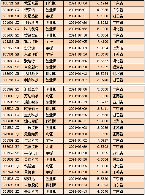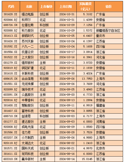 具体从归属地来看,广东省有15家企业登陆A股。其中,拉普拉斯、龙图光罩、欧莱新材在科创板上市,永兴股份在沪市主板上市,广合科技在深市主板上市,强达电路、长联科技、博实结、绿联科技、乔锋智能、汇成真空、骏鼎达、美新科技、美信科技在创业板上市,芭薇股份在北交所上市。上述15家企业合计募集资金总额101.75亿元。