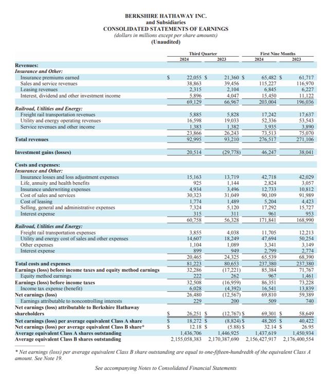 11月2日,“股神”巴菲特旗下伯克希尔·哈撒韦公司公布2024年度第三季度财务报告。