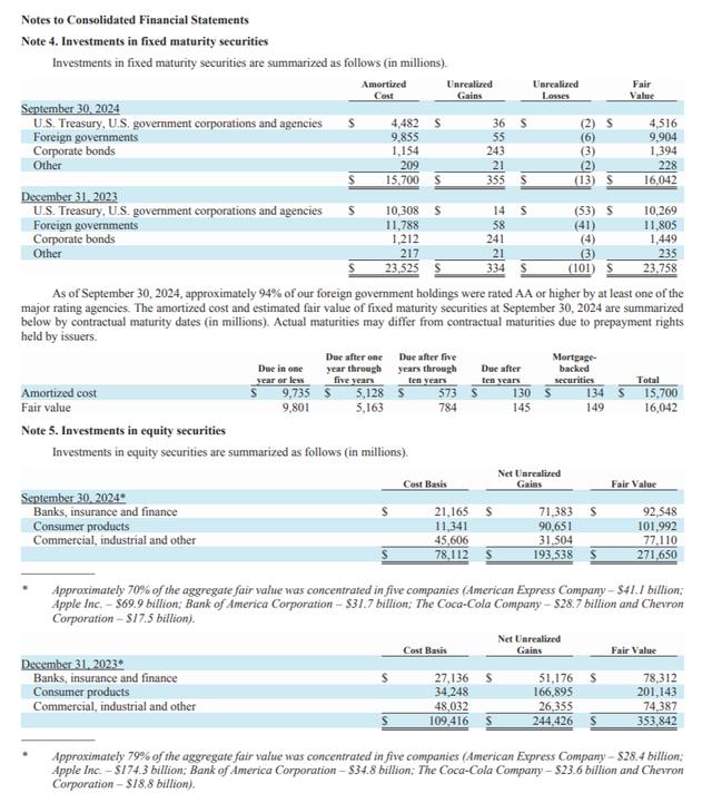 截至三季度末,伯克希尔·哈撒韦持有的固定收益证券投资公允价值达160.42亿美元,其中,对美债、外国债券、企业债券的投资公允价值分别为45.16亿美元、99.04亿美元、13.94亿美元。