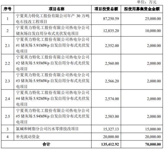英力特2024年4月26日披露的向特定对象发行证券募集说明书(申报稿) 显示,公司本次向特定对象发行股票募集资金总额不超过70,000万元(含本数),扣除发行费用后拟投向以下项目:宁夏英力特化工股份有限公司年产30万吨电石技改工程项目、宁夏英力特化工股份有限公司热电分公司储灰场自发自用分布式光伏发电项目、氯碱和树脂分公司污水零排技改项目和补充流动资金。