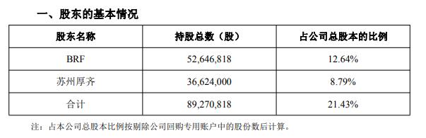 持有公司股份52,646,818股(占公司总股本比例为12.64%,公告所述公司总股本均按照剔除回购专用证券账户股份后的总股本计算,下同)的股东BRF计划在公告披露之日起15个交易日后的3个月内以集中竞价、大宗交易方式减持公司股份。自公告披露之日起15个交易日后的3个月内通过集中竞价、大宗交易方式减持股份不超过公司总股本的2%,即不超过8,332,877股,且任意连续90个自然日内通过集中竞价交易减持的股份总数量不超过公司总股本的1%,即不超过4,166,438股。
