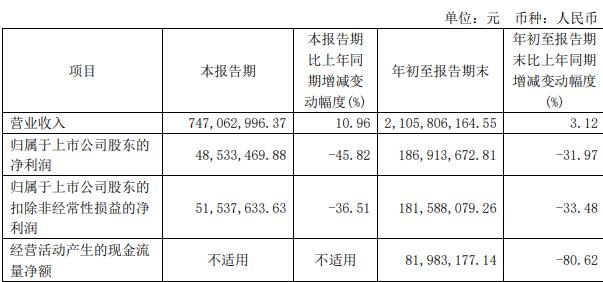年初至报告期末,公司实现营业收入21.06亿元,同比增长3.12%;归属于上市公司股东的净利润1.87亿元,同比减少31.97%;归属于上市公司股东的扣除非经常性损益的净利润1.82亿元,同比减少33.48%;经营活动产生的现金流量净额为8198.32万元,同比减少80.62%。