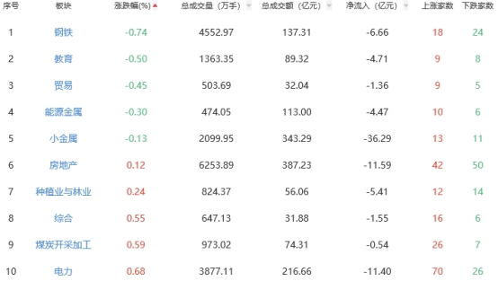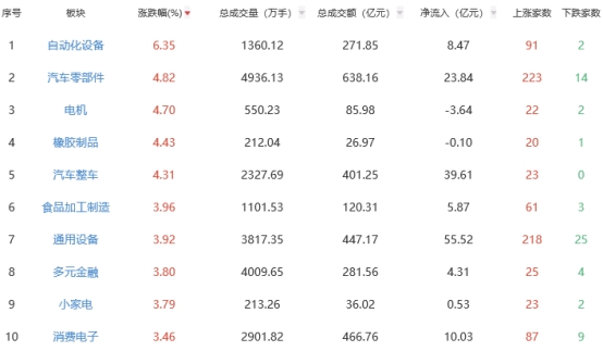 板块方面,自动化设备、汽车零部件、电机、橡胶制品、汽车整车等板块涨幅居前,钢铁、教育、贸易、能源金属、小金属板块下跌。