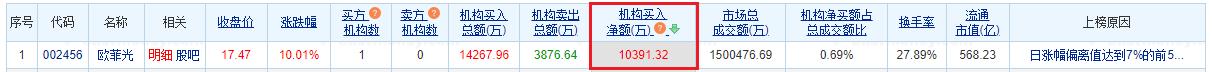龙虎榜数据显示,欧菲光买入金额最大的前五名中,有1家机构专用席位。经统计,欧菲光的机构席位今日净买入金额为10391.32万元。