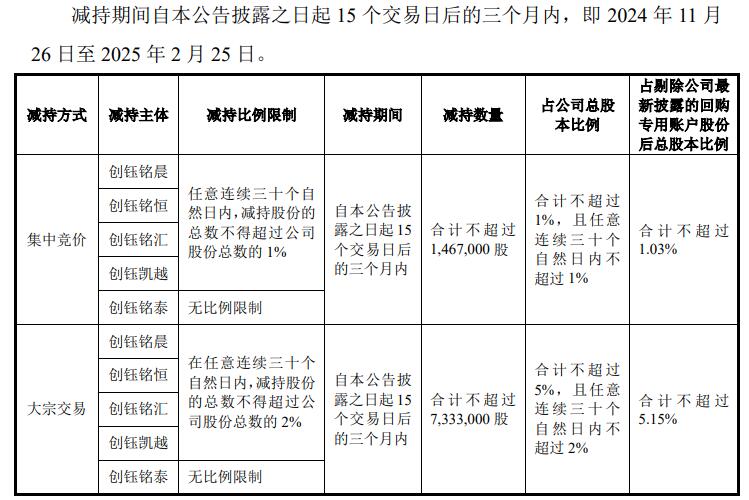 合计持有绿通科技股份18,005,533股(占公司总股本的12.27%,占剔除公司最新披露的回购专用账户股份后总股本的12.65%)的股东创钰铭晨及其一致行动人创钰铭恒、创钰铭汇、创钰凯越、创钰铭泰计划在自减持计划公告之日起15个交易日后的3个月内以集中竞价方式和大宗交易方式合计减持公司股份不超过8,800,000股(占公司总股本的6.00%,占剔除公司最新披露的回购专用账户股份后总股本的6.18%),其中,通过集中竞价方式减持公司股份合计不超过1,467,000股(占公司总股本的1.00%,占剔除公司最新披露的回购专用账户股份后总股本比例1.03%);通过大宗交易方式减持公司股份合计不超过7,333,000股(占公司总股本的5.00%,且任意连续三十个自然日内不超过2%,合计占剔除公司最新披露的回购专用账户股份后总股本比例5.15%)。