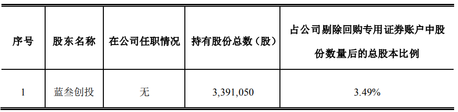 截至公告披露日,蓝叁创投持有江苏博云3,391,050股,占公司总股本比例3.42%,占剔除公司回购专用账户持股数量1,920,010股后的总股本的3.49%。
