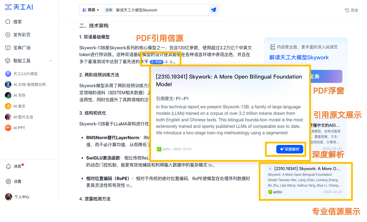搜索“大模型对齐技术”,映入眼帘的是十多篇来自arXiv的论文,天工AI不仅帮用户直接分析了这些论文,还将PDF原文一一对应到相应的论点中去,用户能直接溯源点击查看原论文。