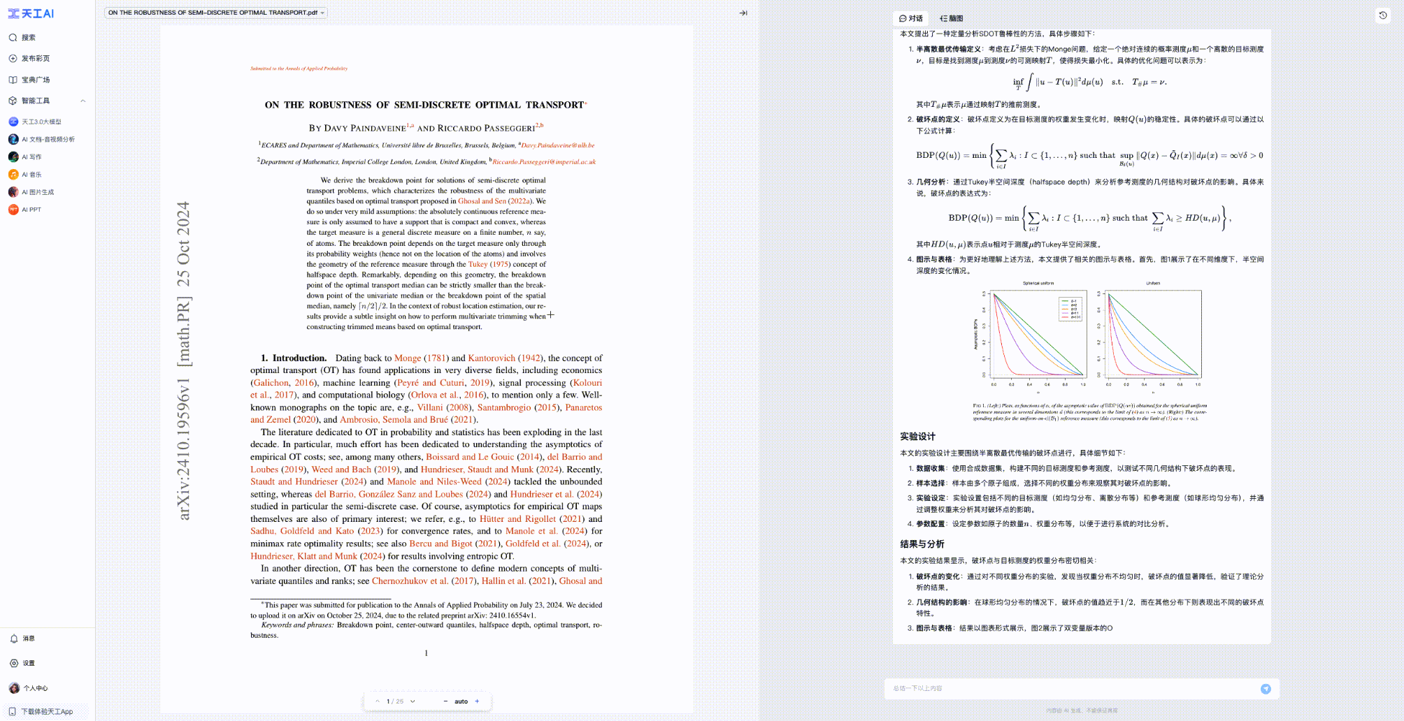 其次,「天工AI阅读」新增了针对学术论文、公司财报、券商研报等场景的深度解析模式,点击文档深度解析后可直达文档AI解读和AI对话功能,可以对完整的文档进行精读,并且产生图文并茂的AI解读。
