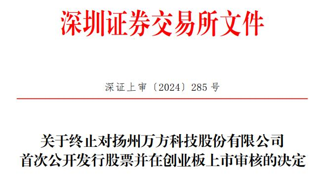 深交所于2022年6月30日依法受理了万方科技首次公开发行股票并在创业板上市的申请文件,并依法依规进行了审核。日前,万方科技向深交所提交了《扬州万方科技股份有限公司关于撤回首次公开发行股票并在创业板上市申请文件的申请》,保荐人向深交所提交了《招商证券股份有限公司关于撤回扬州万方科技股份有限公司首次公开发行股票并在创业板上市的申请》。根据《深圳证券交易所股票发行上市审核规则(2024 年修订)》第六十二条的有关规定,深交所决定终止对万方科技首次公开发行股票并在创业板上市的审核。