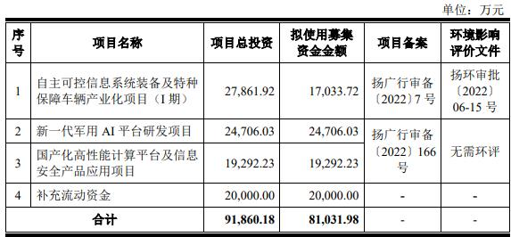 万方科技原拟在深交所创业板发行股票数量19,250,000股,原拟募集资金81,031.98万元,计划用于自主可控信息系统装备及特种保障车辆产业化项目(I期)、新一代军用AI平台研发项目、国产化高性能计算平台及信息安全产品应用项目、补充流动资金。
