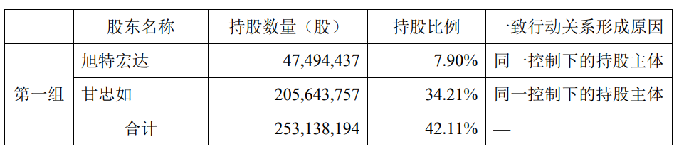 旭特宏达及其一致行动人甘忠如合计持有公司253,138,194股,占公司总股本的42.11%。其中旭特宏达持有公司股份47,494,437股,占公司总股本的7.90%。甘忠如持有公司股份205,643,757股,占公司总股本的34.21%。