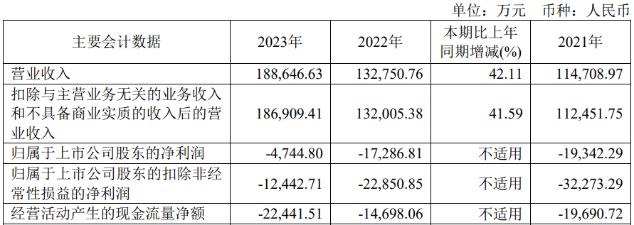 埃夫特此前三年均亏损。2023年,公司实现营业收入188,646.63万元,同比增长42.11%;归属于上市公司股东的净利润-4,744.80万元,2022年为-17,286.81万元;归属于上市公司股东的扣非净利润-12,442.71万元,2022年为-22,850.85万元;经营活动产生的现金流量净额-22,441.51万元,2022年同期为-14,698.06万元。