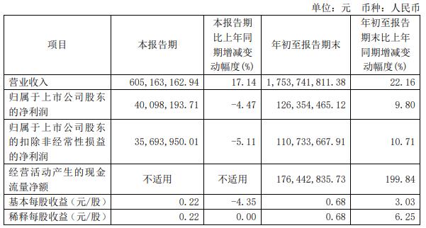2024年前三季度,嵘泰股份实现营业收入17.54亿元,同比增长22.16%;归属于上市公司股东的净利润1.26亿元,同比增长9.80%;归属于上市公司股东的扣除非经常性损益的净利润1.11亿元,同比增长10.71%;经营活动产生的现金流量净额为1.76亿元,同比增长199.84%。