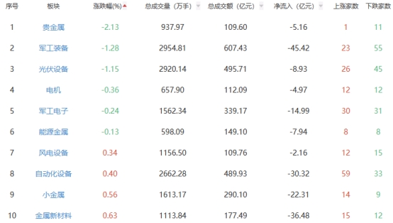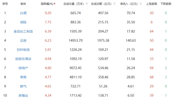 盘面上,白酒、保险、食品加工制造等板块涨幅居前,贵金属、军工装备、光伏设备等板块跌幅居前。