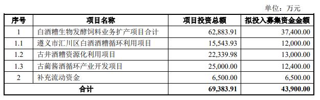 路德环境向不特定对象发行可转换公司债券证券募集说明书(申报稿)显示,本次向不特定对象发行可转换公司债券拟募集资金总额不超过人民币43,900万元(含本数),扣除发行费用后将全部用于白酒糟生物发酵饲料业务扩产项目(遵义市汇川区白酒酒糟循环利用项目、古井酒糟资源化利用项目、古蔺酱酒循环产业开发项目)、补充流动资金。