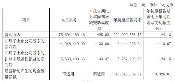 路德环境2024年第三季度报告显示,2024年第三季度,路德环境实现营业收入7669.45万元,同比下滑28.02%;归属于上市公司股东的净利润-494.84万元,同比下滑133.60%;归属于上市公司股东的扣除非经常性损益的净利润-553.94万元,同比下滑143.47%。
