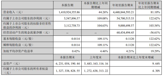 2024年前三季度,弘信电子实现营业收入44.49亿元,同比增长81.10%;归属于上市公司股东的净利润5470.05万元,同比增长122.62%;归属于上市公司股东的扣除非经常性损益的净利润90.09万元,同比增长103.54%;经营活动产生的现金流量净额为6043.45万元,同比下滑56.61%。
