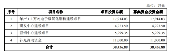 江南新材拟在上交所主板募资3.84亿元,用于年产1.2万吨电子级氧化铜粉建设项目、研发中心建设项目、营销中心建设项目、补充流动资金。