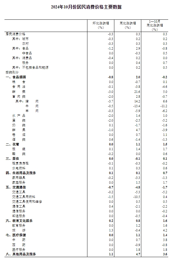 10月份,全国居民消费价格环比下降0.3%。其中,城市下降0.3%,农村下降0.3%;食品价格下降1.2%,非食品价格持平;消费品价格下降0.4%,服务价格持平。